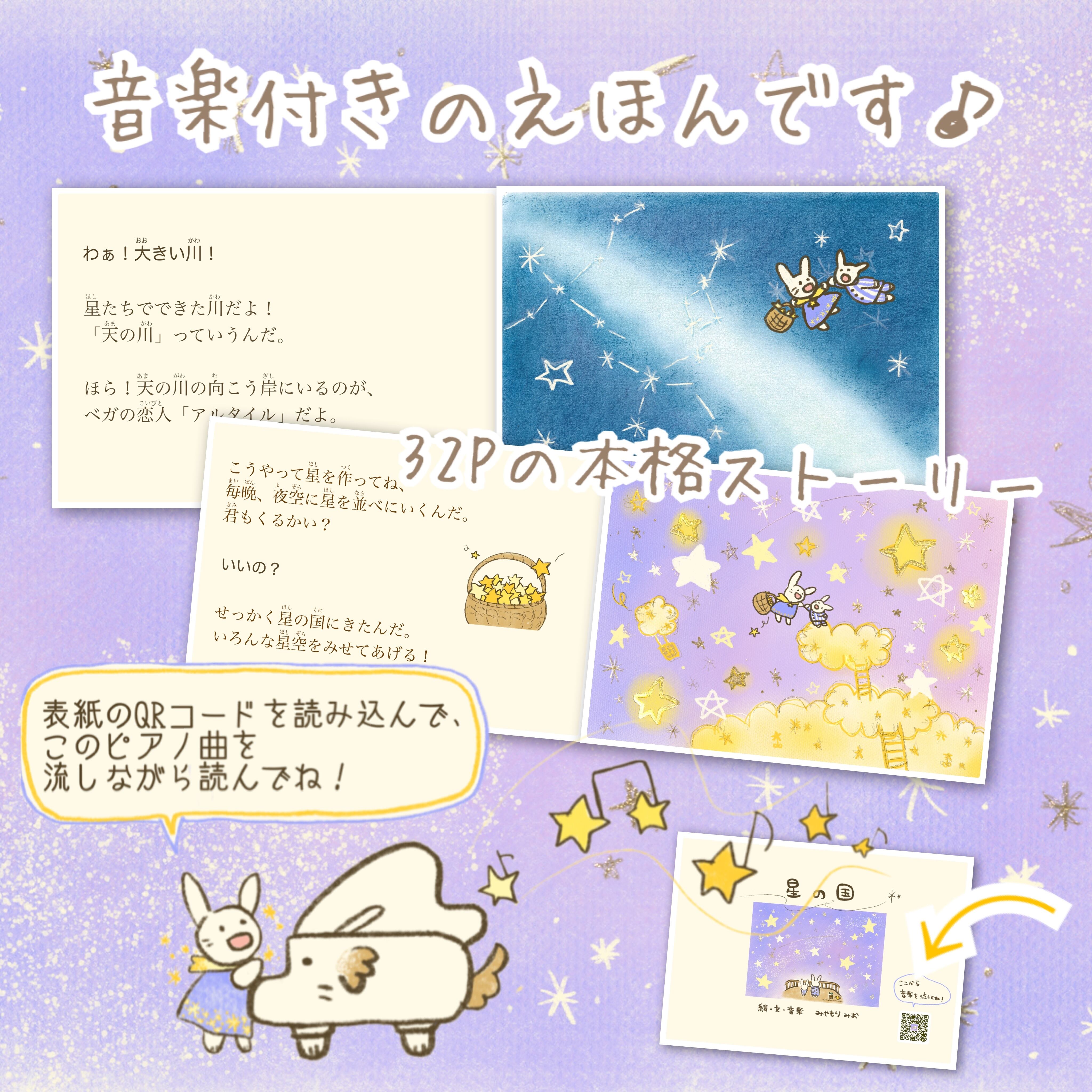 音楽えほん「星の国」シリーズは、みんなの想いが星になってできた不思議な国「星の国」を舞台に、星うさぎとピアノ犬がいろんな「想い」を抱えた星たちを巡る物語を描いたシリーズです。