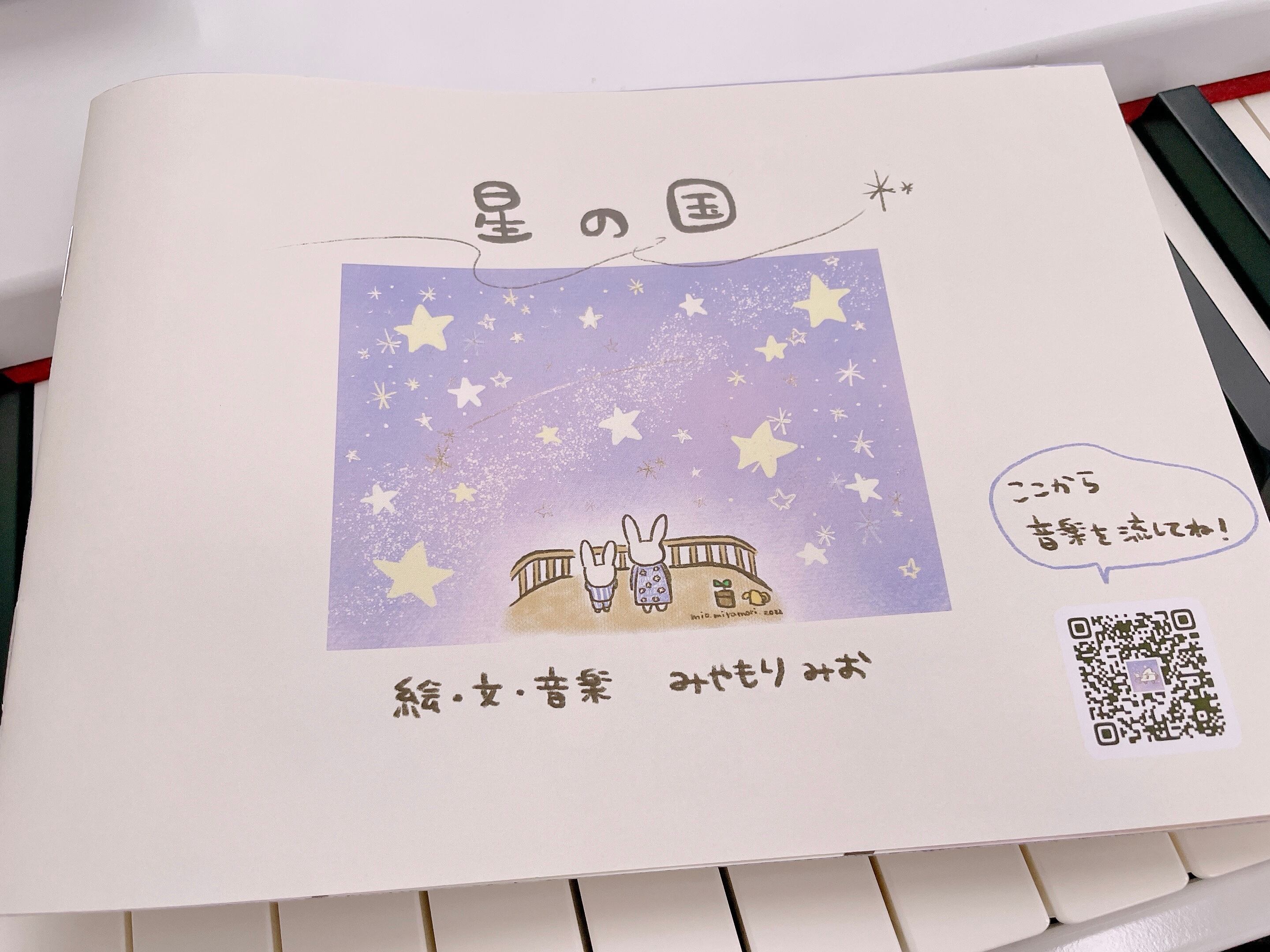 音楽えほんのQRコードを読み込むと、絵本オリジナルのピアノ曲が流れます。